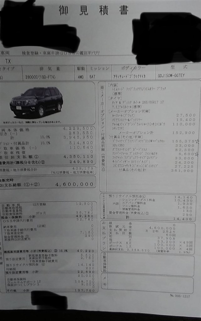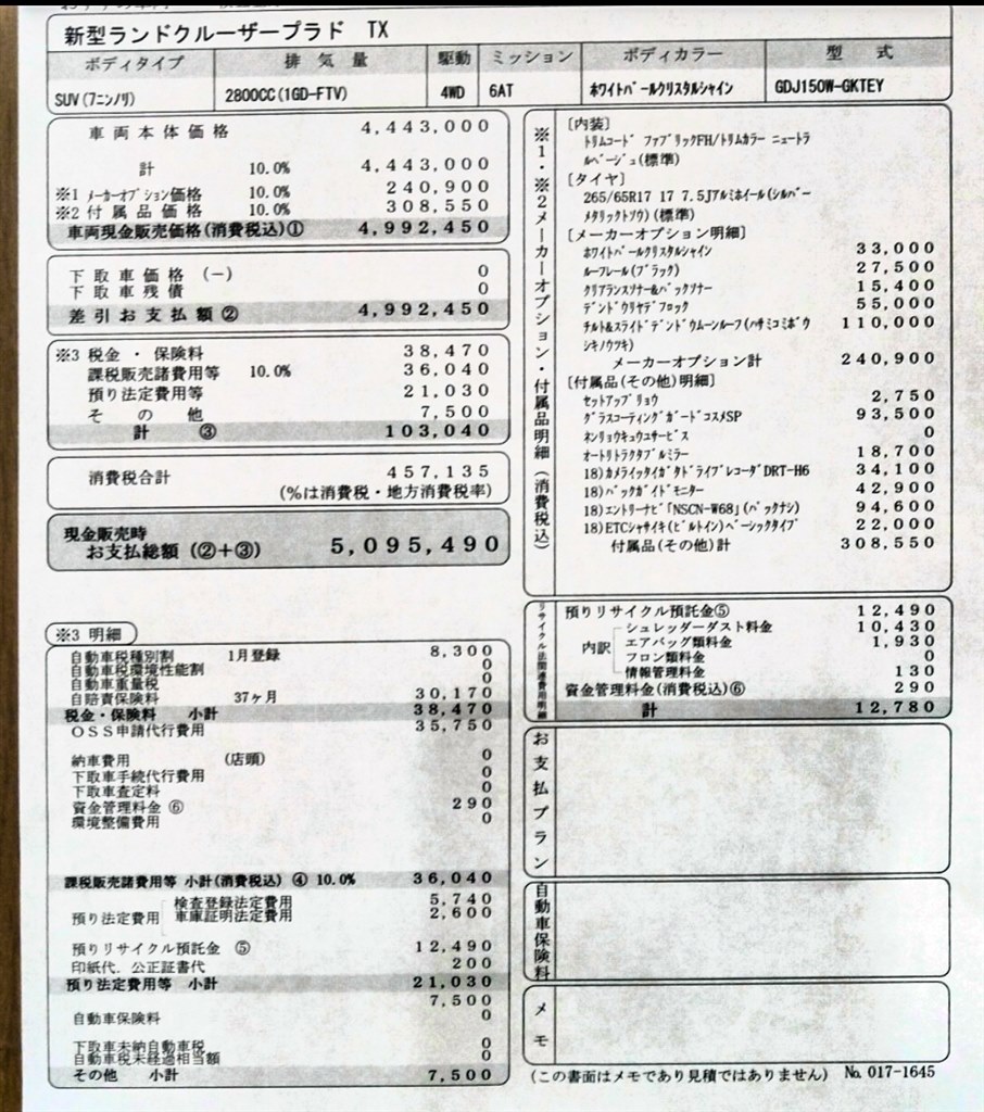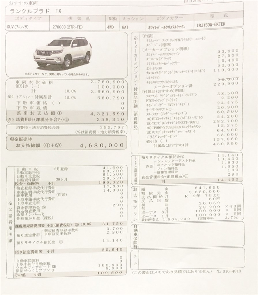 トヨタ ランドクルーザープラドの新車乗り出し価格は?見積もり書を公開夢あるカーライフ 夢カー。