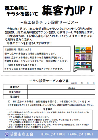 本日、参加させて頂いてる、 『幸手市商工会青年部』 の幸手市駅中のチラシ置きに、チラシを入れさせて頂きました。 チラシを作ってから、お問い合わせも頂いており、サンプル作成などさせて頂いております。幸手駅をお使いの方、是非手に取って拝見してみて下さい。