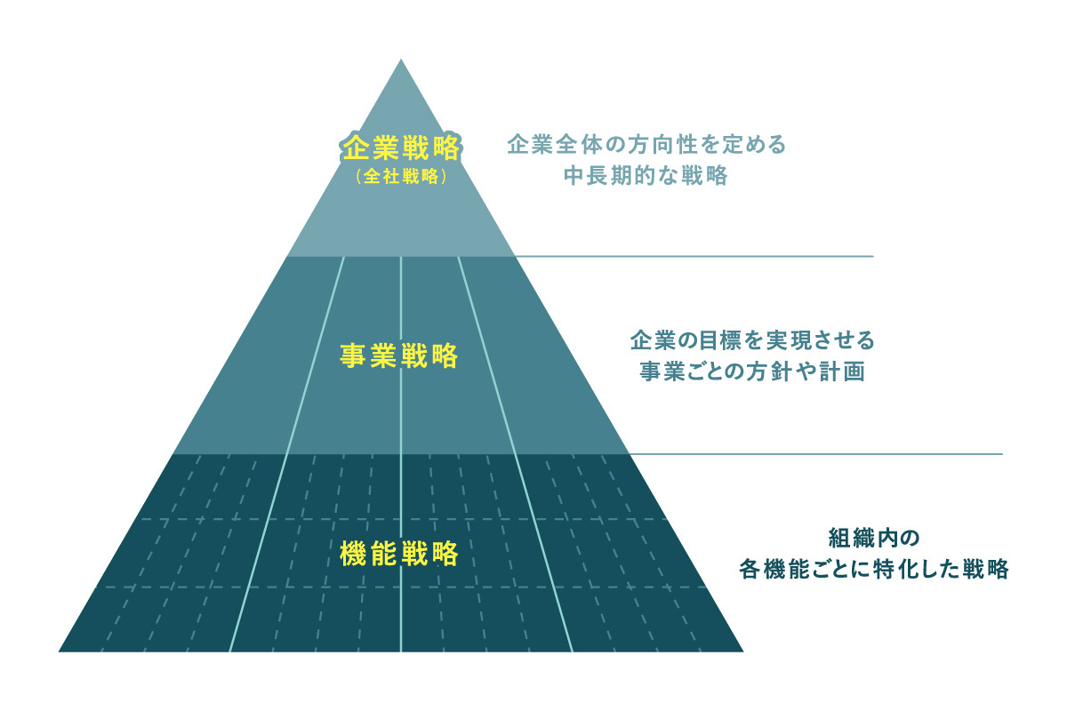 経営戦略とは?企業戦略・事業戦略・機能戦略の違いと意味:階層構造を図解。