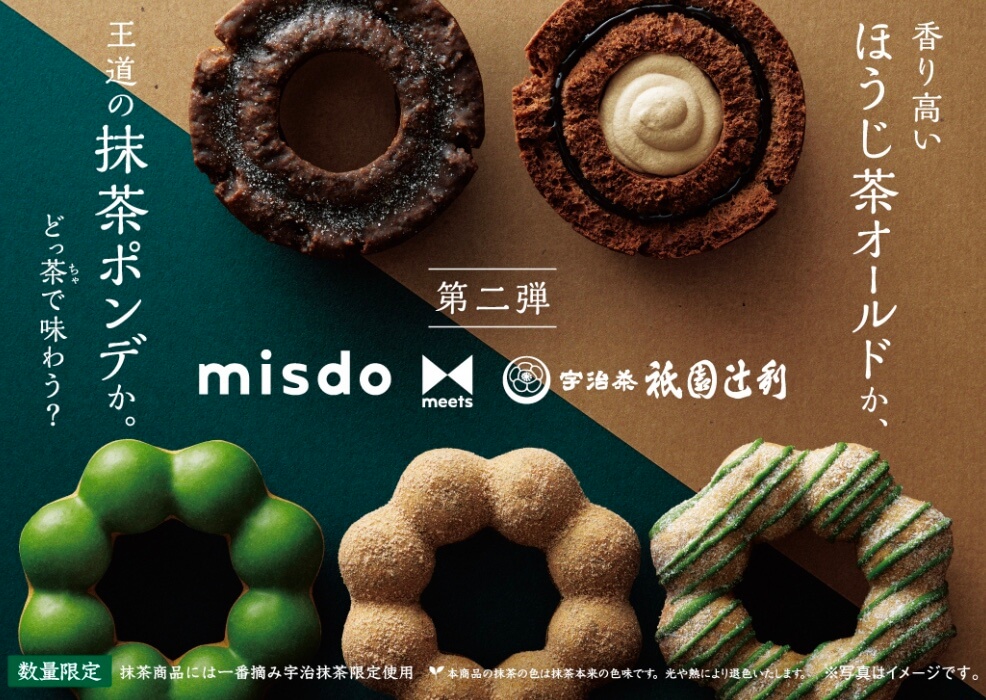 飲料・食品、スタイリッシュ・おしゃれ、高級感・きれいめ、シズル感、和風のバナーmisdo meets 祇園辻利新商品ミスタードーナツBANNER LIBRARY。