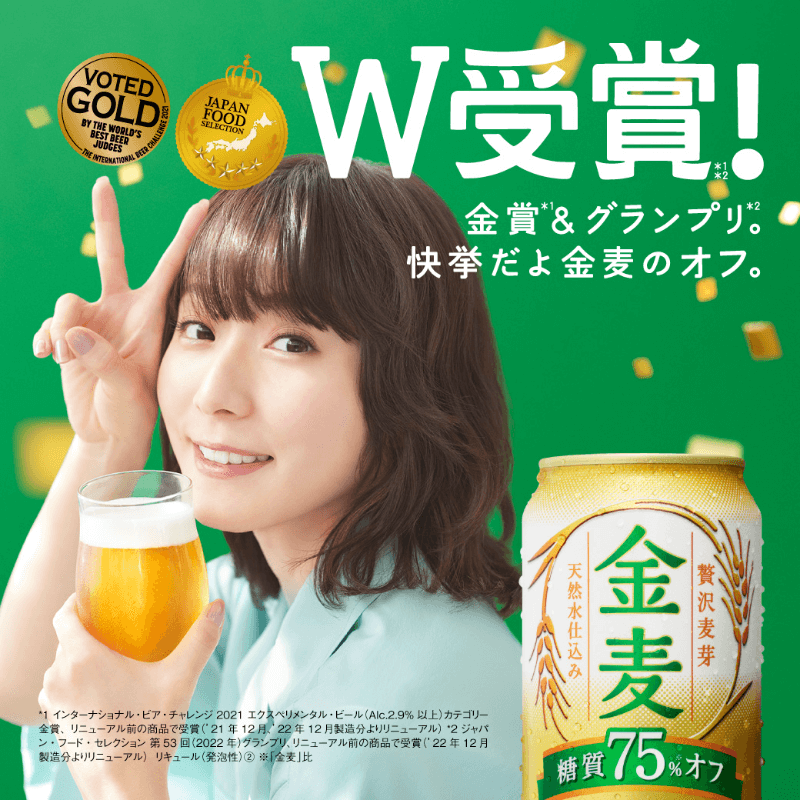 飲料・食品、ナチュラル・爽やか、カジュアル、にぎやか・ポップ、人物写真のバナー気にせず、しあわせ。 W受賞の金麦のオフBANNERLIBRARY。