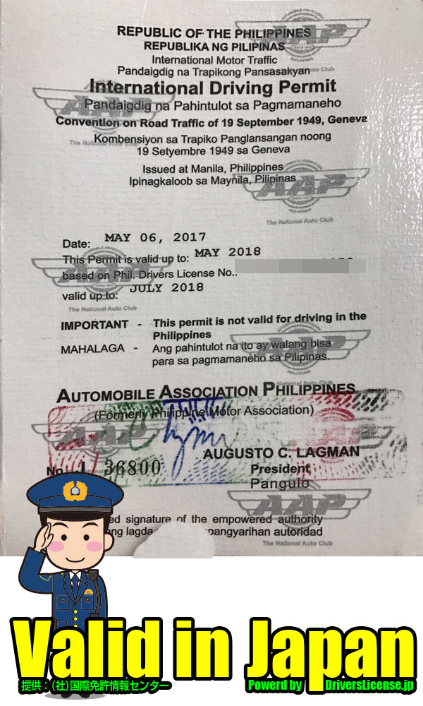 フィリピン共和国の国際免許日本で有効な国際運転免許証。