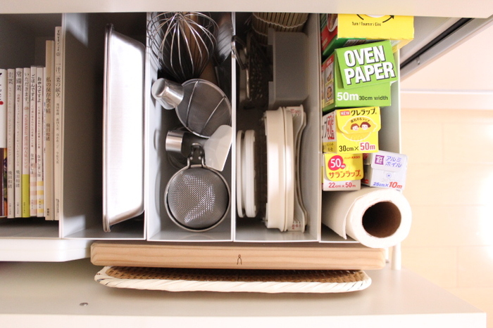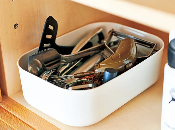 ファイルボックスをフル活用。投げ込む&置くだけの調理器具収納。なんとなく片づく「暮らしの仕組みづくり」。