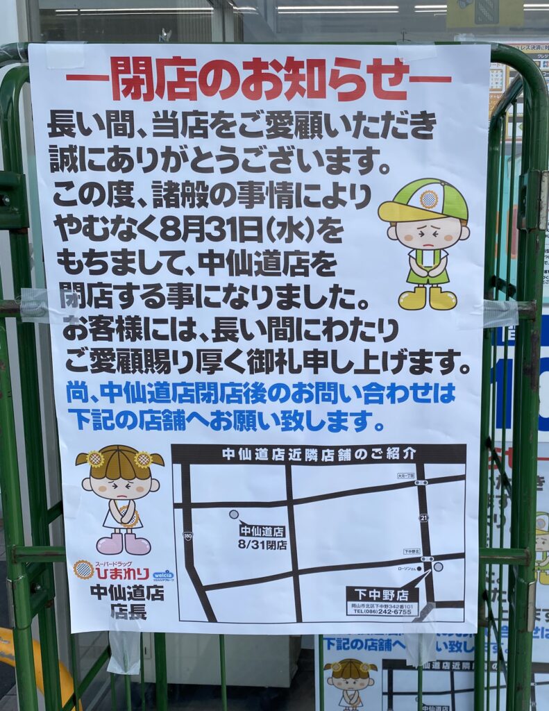 岡山市北区 「スーパードラッグひまわり 中仙道店」が8月31日閉店。
