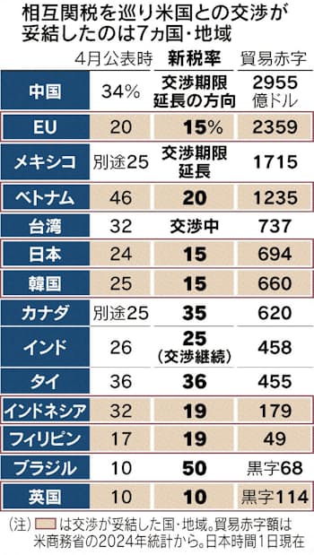 米相互関税、新税率発動へ 1日交渉期限、大統領令に署名後 - 日本経済新聞。