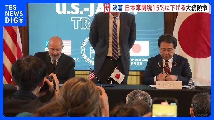 日米の“トランプ関税”協議が決着トランプ大統領が自動車関税15%に引き下げなどの大統領令に署名TBS NEWS DIG。