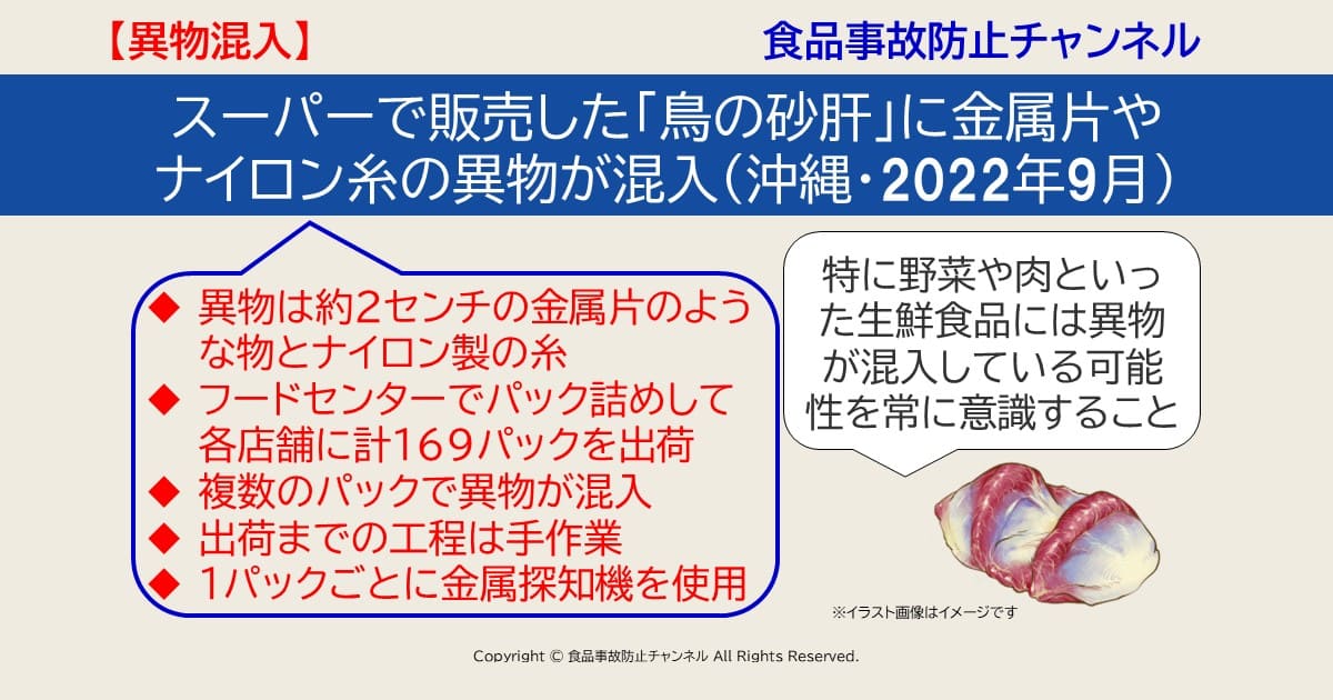 スーパーで販売した「鳥の砂肝」に金属片やナイロン糸の異物が複数のパックに混入 沖縄・2022年9月食品事故防止チャンネル 食品表示・食品衛生・学校給食・異物混入・危機管理・企業研修。