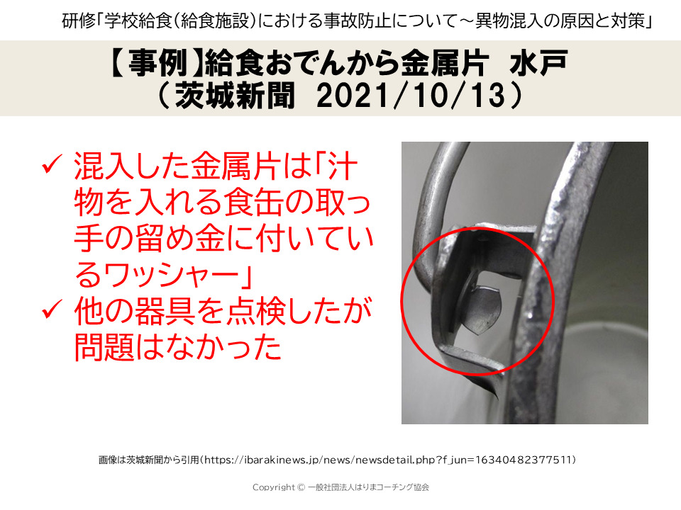給食施設での異物混入の事例 研修で使用食品事故防止チャンネル 食品表示・食品衛生・学校給食・異物混入・危機管理・企業研修。
