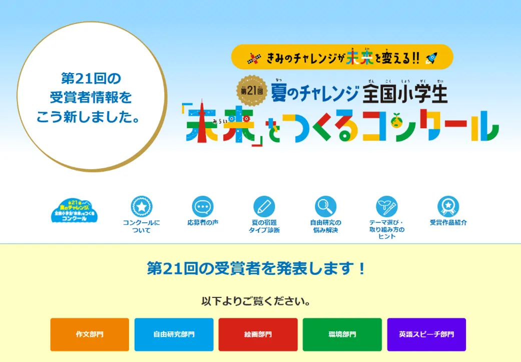 全国小学生『未来』をつくるコンクール」を開催!9月10日まで、作文・自由研究・環境・絵画の作品を募集株式会社ベネッセコーポレーションのプレスリリース。