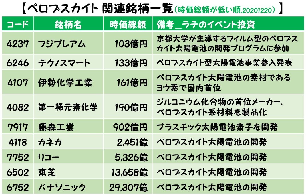 ラテ_テーマ株まとめ on X: " 次世代太陽電池「ペロブスカイト」脱炭素へ期待↓日経ニュース https:t.co aszTPcHQcHペロブスカイト太陽電池や 全固体電池等 最近は脱炭素に向けた先端技術のニュースが絶えないです。 今回はペロブスカイト銘柄一覧を画像にしました。