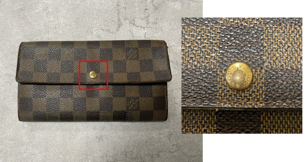 ヴィトン ダミエ 二つ折り 財布 ヴィトン ダミエ二つ折り財布の修理;「折り曲げる下の部分の縫い目がほつれ、柄の面の縁の塗装が剥がれています。」・K's factory - かばん修理 の K'sfactory ~修理例とお客様のお声~。