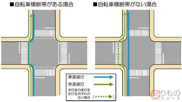 自転車横断帯」がクルマを惑わせる? 横断歩道に併設のアレ、撤去進むワケ 乗りものニュース。