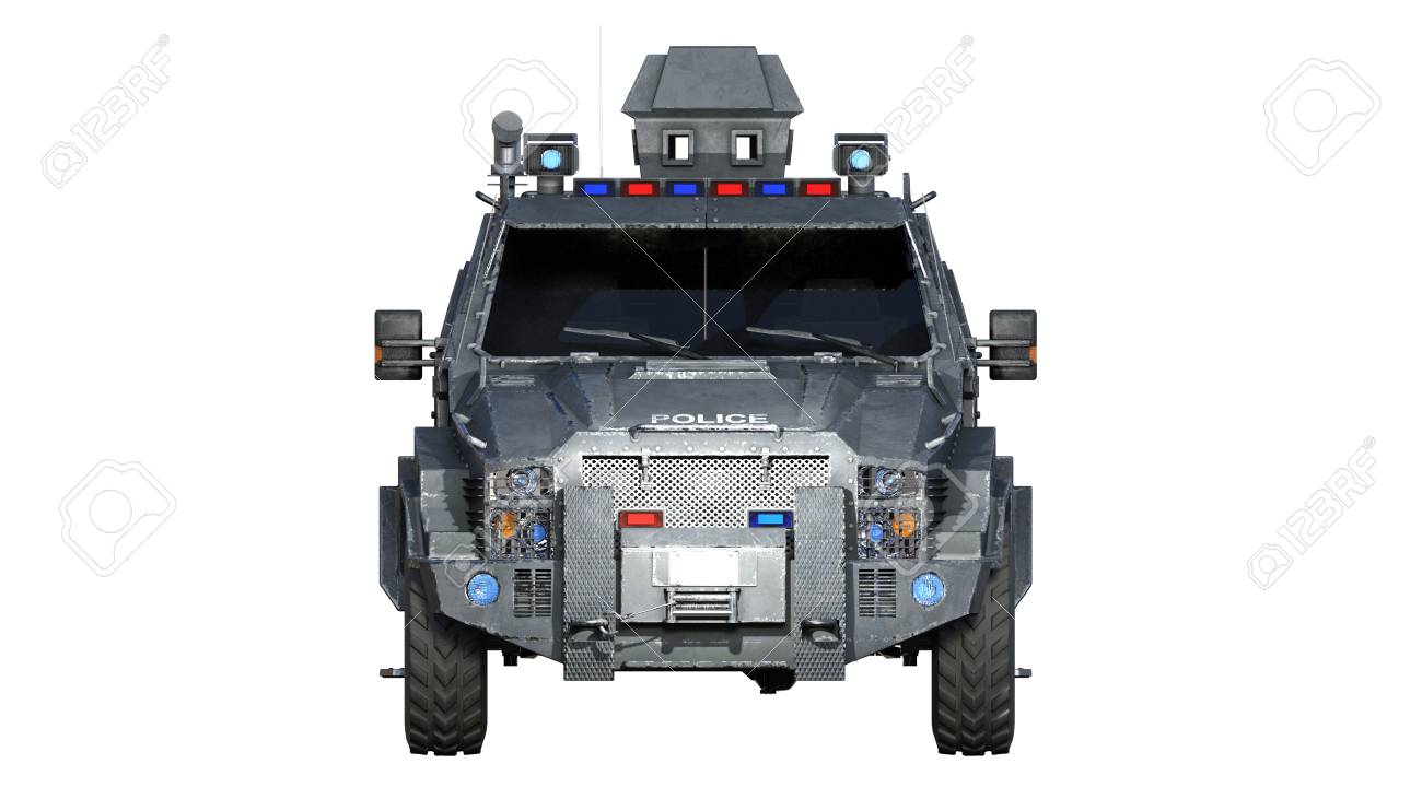装甲SUVトラック、防弾警察車両、白い背景に隔離された法執行機関の車、フロントビュー、3Dレンダリングの写真素材・画像素材 Image115430587。