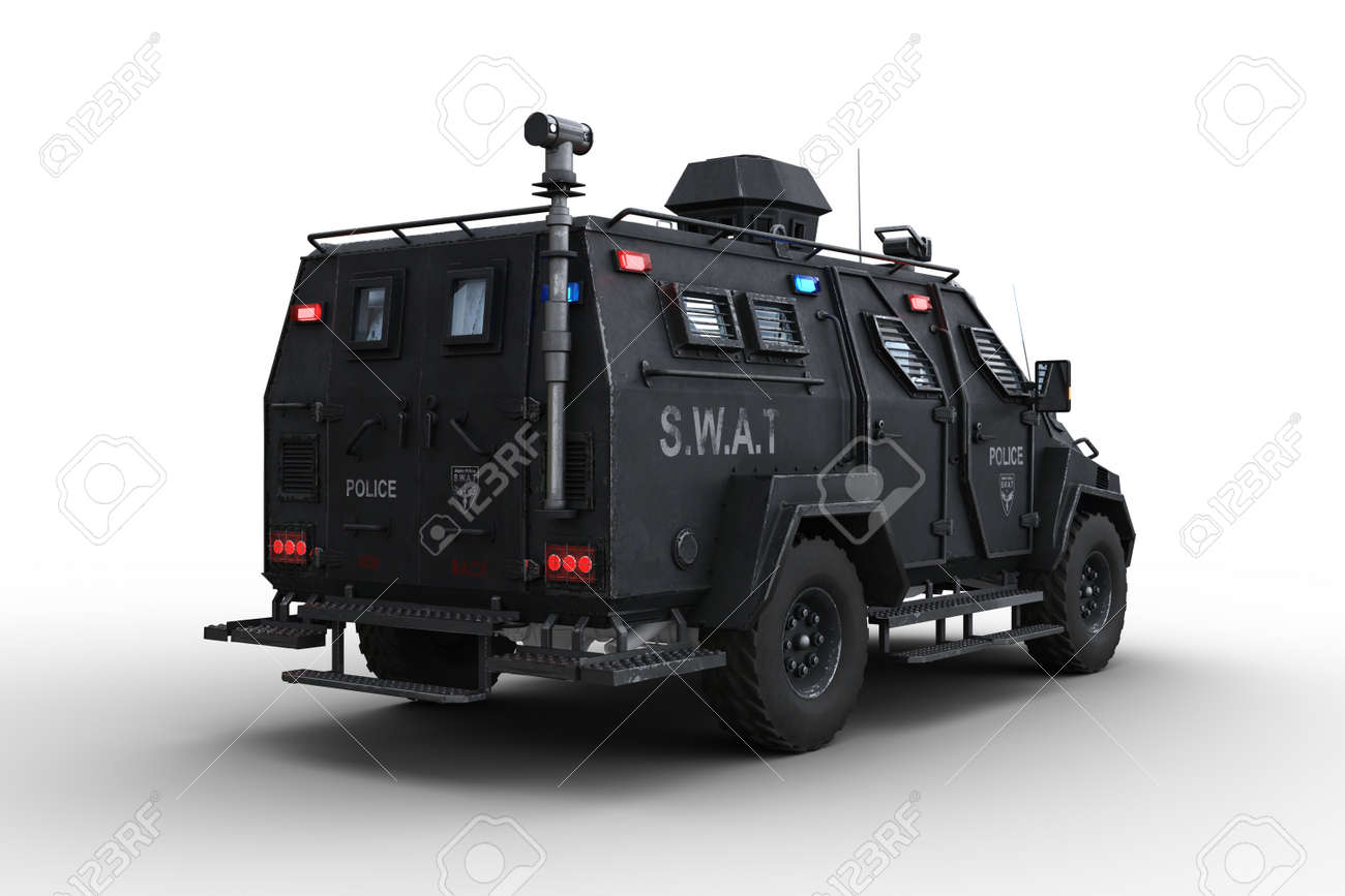 後部コーナーから見た装甲警察特型警備車。白い背景で隔離の3Dイラスト。の写真素材・画像素材 Image 174382993。