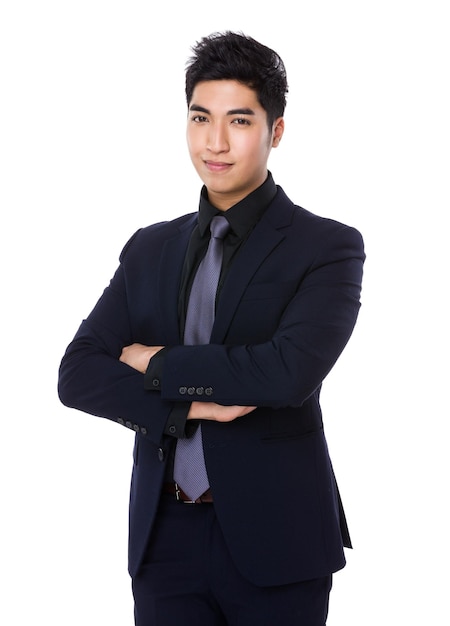 腕を組んでポーズをとるアジアの青年実業家Premium写真。